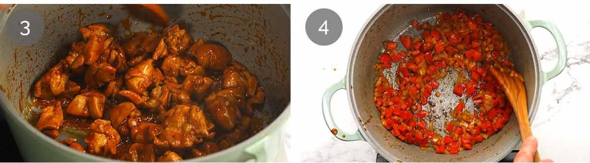 Sear chicken – Heat the oil in a large heavy based pot over high heat, then sear the chicken until the spices are sizzling on the surface of the chicken and you get a bit of colour, but it’s still raw inside. Remove the chicken with a slotted spoon to leave the fat behind.