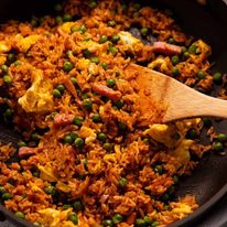 Fried rice always makes for a great quick meal if you can incorporate enough “stuff” into it to fill it out from a nutrition perspective so you can justify calling it “dinner” rather than just a side dish. Today we’re turning to frozen peas, pre-chopped ham and egg for literal no-effort, no-prep add-ins to make this tasty dish I’ve called Red Vietnamese Fried Rice.