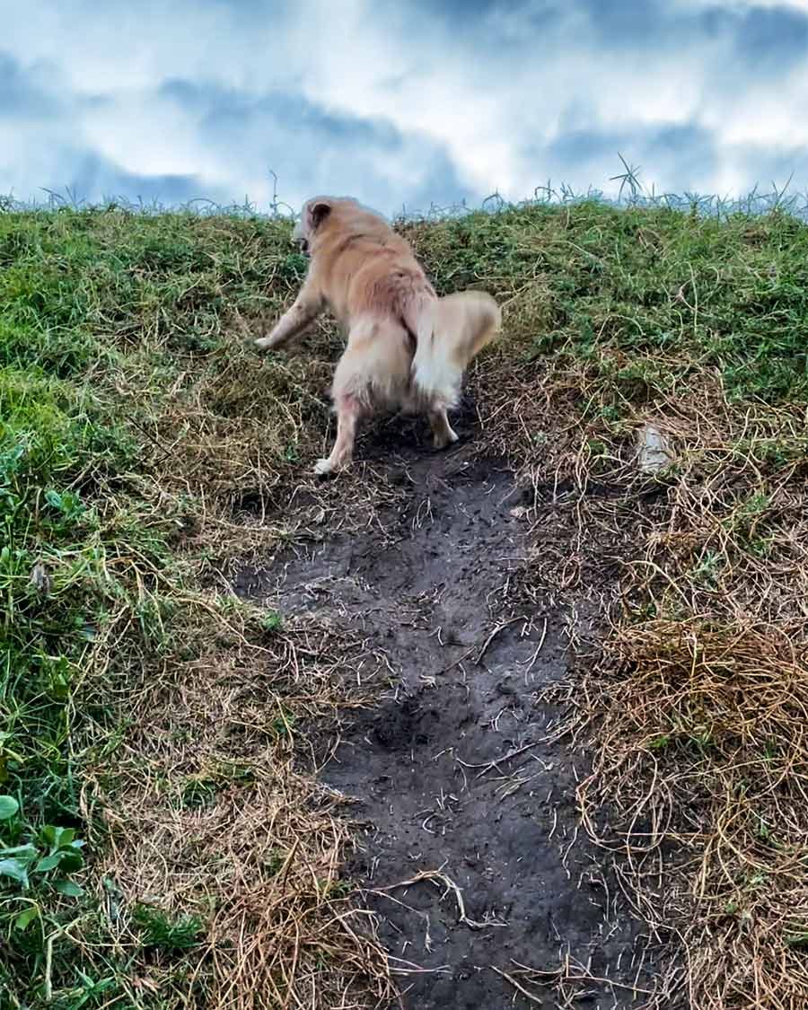 Come on Dozer! You can do it – climb, climb! (And climb he did – bit of slipping and sliding going on, but he got to the top of the “mountain”!)