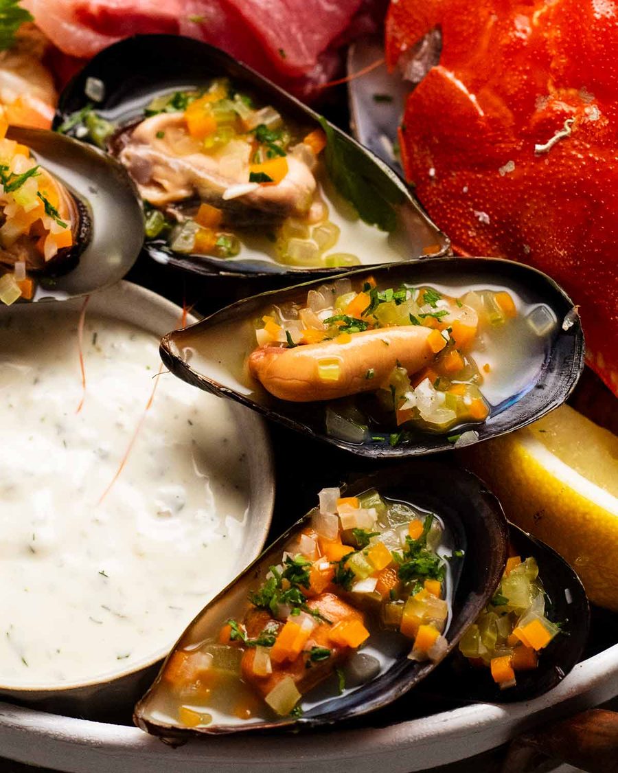 - Mussels – cooked using this cookbook recipe or this recipe, but dice the vegetables very small (to use as garnish on mussels). Cool to room temperature then serve on platter.