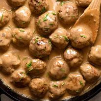 I made this with ground turkey, gluten free bread & flour, whole milk instead of cream. I also added garlic. Now that I’ve made it once, I know it’s a little extra work but straightforward if you have your ingredients ready to go. The meatballs were savory and tender, and I might try to make more gravy next time because it was so good. Served on mashed potatoes with Christmas jam and everyone was happy. Perfect comfort food. Thank you!!