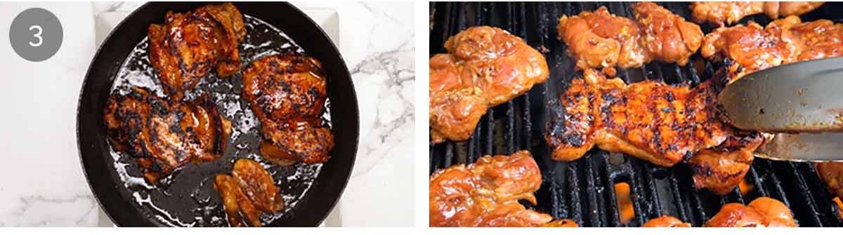 No oil – You shouldn’t need any oil if your BBQ is well greased or if you use a non-stick pan because the marinade has oil in it, and we’re using thighs which has some fat in it.