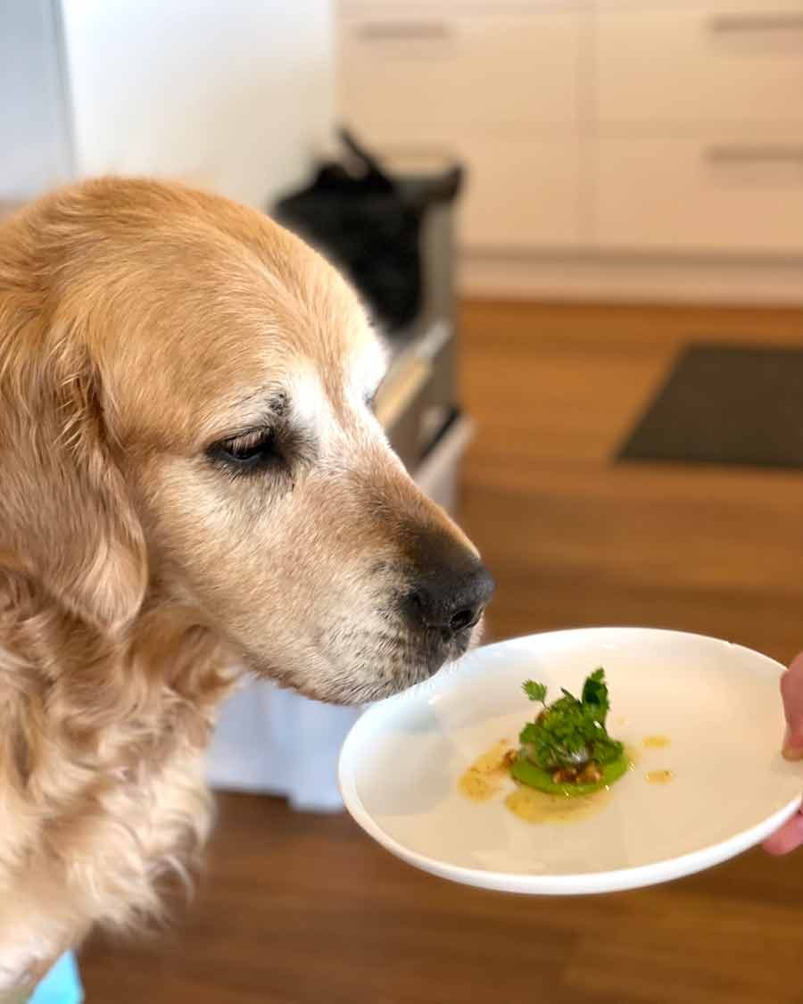 Dozer on the job: taste-testing a prospective recipe for the cookbook!