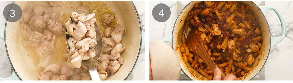 - Seal chicken – Heat sun dried tomato oil in a large heavy based pot over high heat. Add the chicken. sprinkle with salt and pepper. Cook for 3 minutes until the outside is sealed but the inside is still raw. Remove with slotted spoon into a bowl.