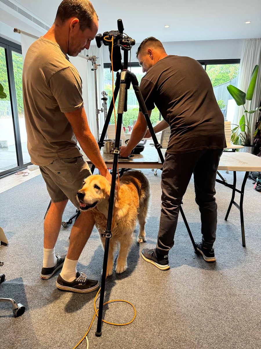 In good news though, high-value food does pique his interest enough to get up and get in the way once again, like he used to! Here he is at a photoshoot yesterday – that’s Rob Palmer (professional photographer) on the left and our Chef JB on the right.